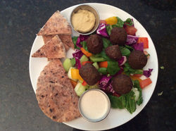 ![]() Round falafel patties inserted in triangular pocket pitas, on top of vegetable salad. Hummus and tahini dips are in the middle. | ![]() Baked round falafel pattieson top of vegetable salad, next to fluffy pita, hummus and tahini. |